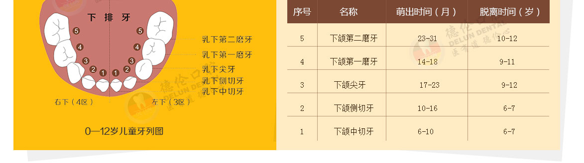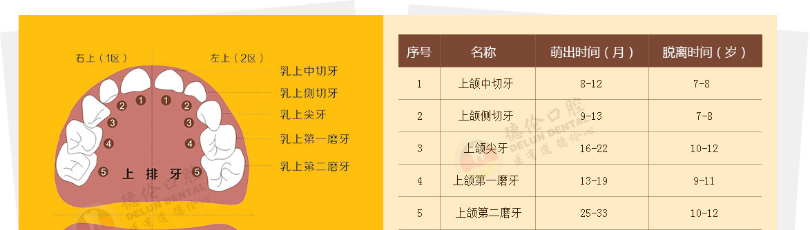 德倫口腔兒童牙科專家提醒:乳牙指嬰兒時期開始萌出的牙,一般寶寶出生后6—8個月乳牙開始萌出,一歲有6—8顆乳牙,通常2歲半前出齊,上下頜各10顆,總共20顆。